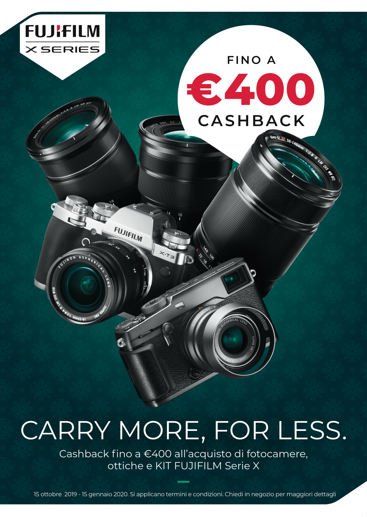 I clienti che acquistano una NUOVA fotocamera o un NUOVO obiettivo FUJIFILM in promozione (“Prodotti in promozione”) tra il 15 Ottobre 2019 e il 15 Gennaio 2020 (“Periodo promozionale”) potranno richiedere un rimborso.