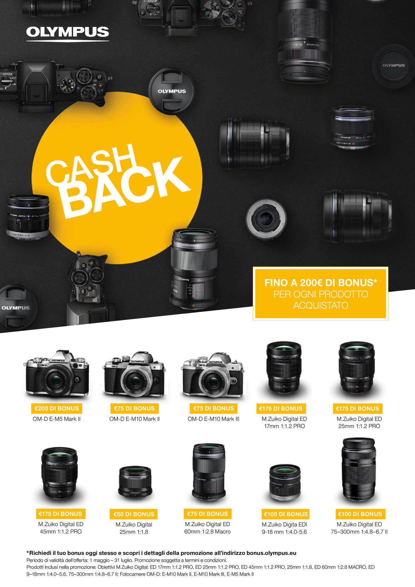 Tutti coloro che acquisteranno uno qualsiasi dei prodotti in promozione tra il primo maggio e il 31 luglio 2018 presso un rivenditore che partecipa alla promozione avranno diritto di ricevere i bonus in denaro elencati di seguito. L’ammontare dei bonus può essere sommato e le richieste dovranno essere inoltrate ad Olympus entro il 31 agosto 2018 esclusivamente effettuando la registrazione online all’indirizzo bonus.olympus.eu. Promozione soggetta a Termini e condizioni.